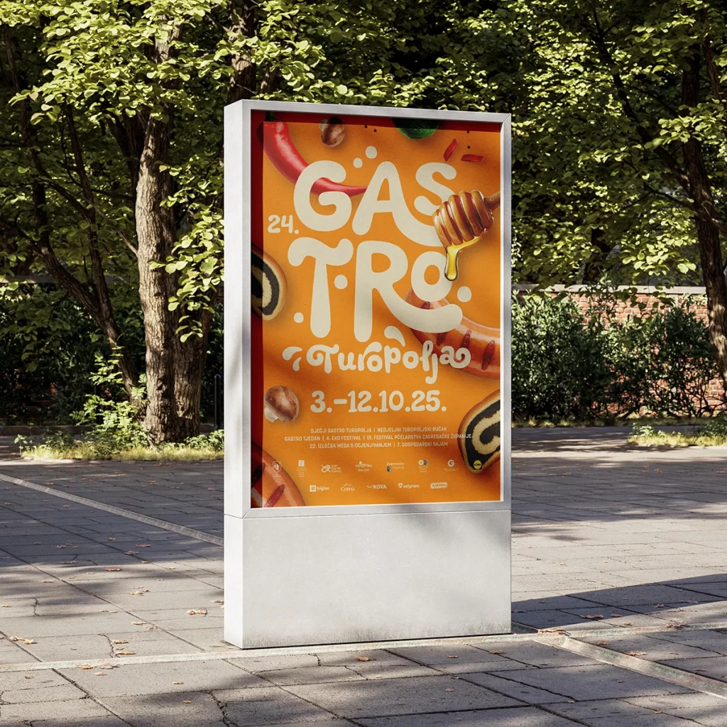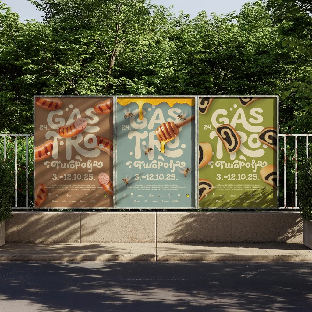 Vrlo brzo projekt je prerastao osnovni identitet. Završili smo s velikim brojem postera, plakata, obilježavanja prostora, signalizacije i kompletnim brendingom događanja. Dizajn je morao funkcionirati u stvarnom prostoru, među ljudima, štandovima, glazbom i hranom. Nije bilo dovoljno da izgleda dobro na ekranu — morao je živjeti, disati i biti dio atmosfere Gastro Turopolja.